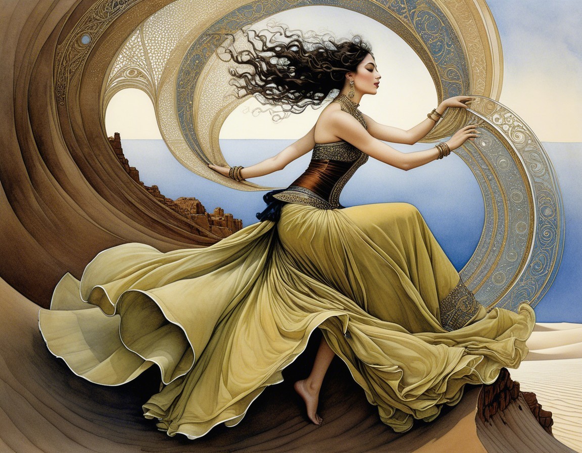 A woman in a flowing, golden gown dances gracefully in a vast desert. Her hair billows in the wind, and sheer fabric swirls around her, creating an enchanting scene against the sandy backdrop.