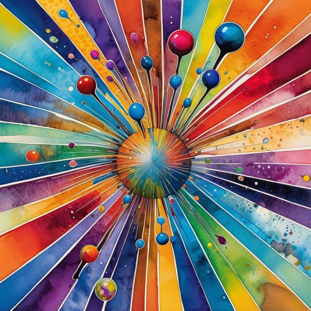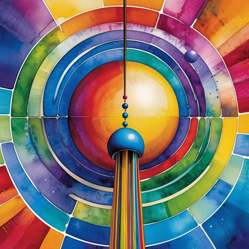 A vibrant, abstract landscape features a tall, colorful tower at its center, surrounded by concentric circles of radiant hues, creating a surreal and mesmerizing atmosphere. A figure stands nearby.