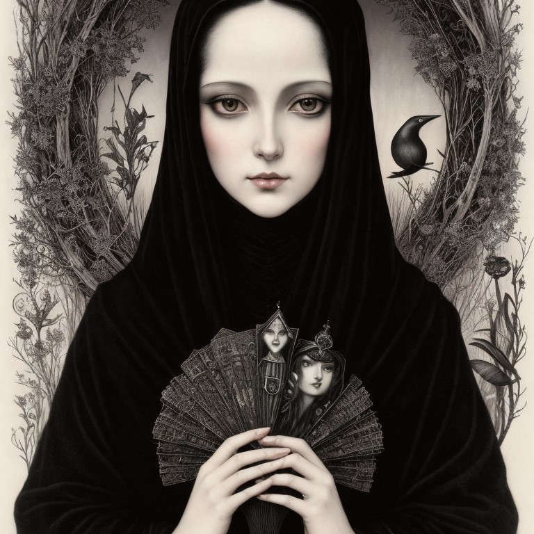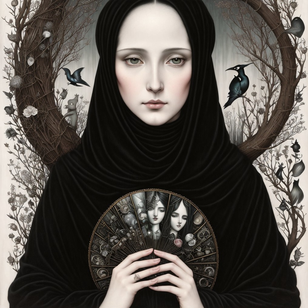 In style of, Daniel Merriam, muted colors, Hieronymus Bosch, Mark Ryden, Vania Zouravliov, H. R. Giger, Aubrey Beardsley, Caspar David Friedrich