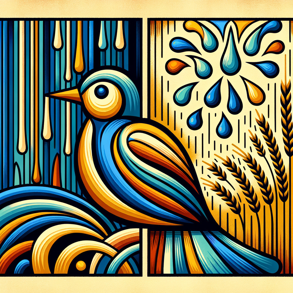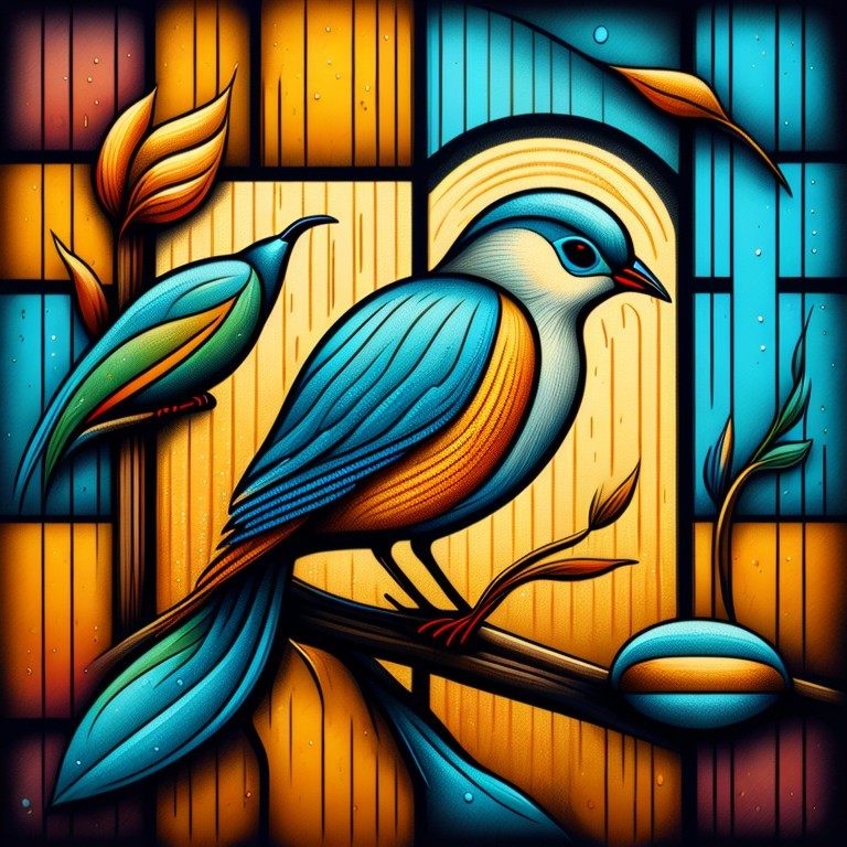 A vibrant, stained glass-style illustration of a bird with intricate patterns and a rich, colorful palette of blues, yellows, and greens.