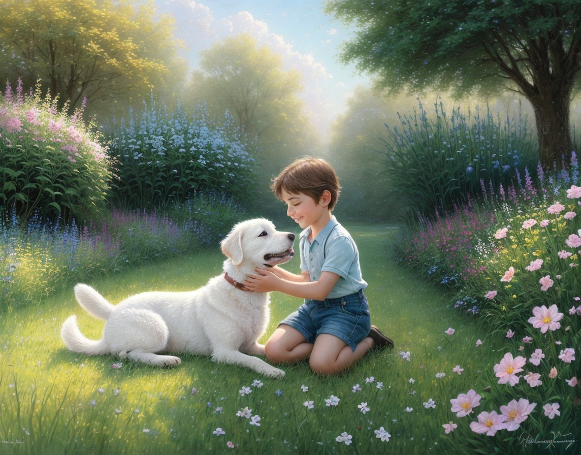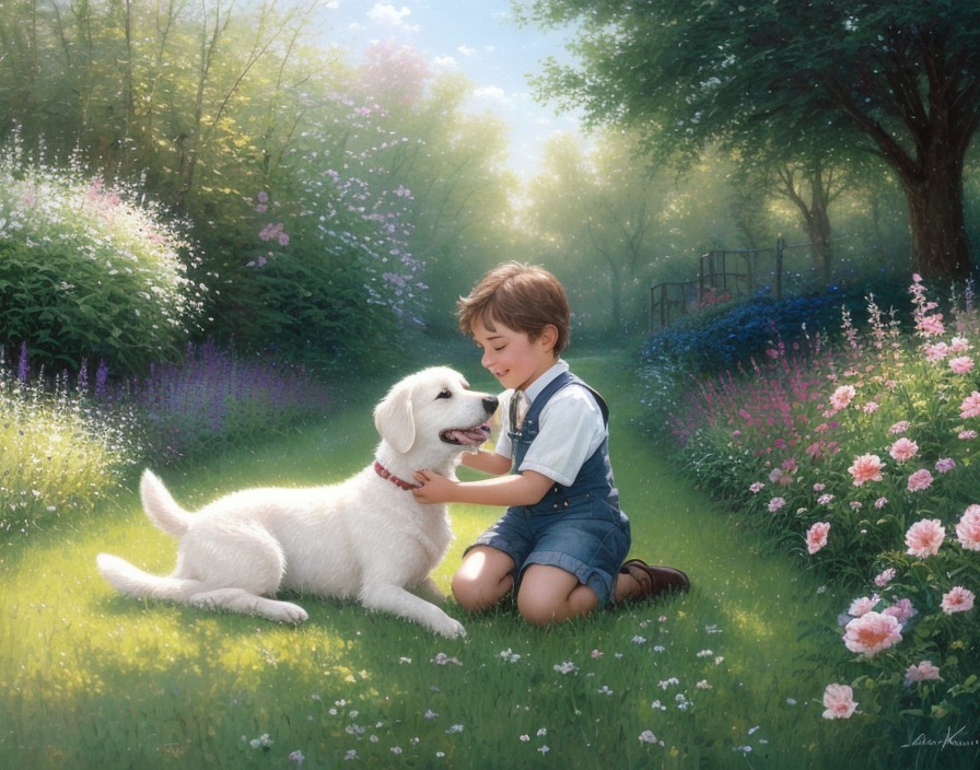 HAPPY, A YOUNG GIRL WHIS A CHILD AND HIS FAT WHITE PYRENEE DOG ROLL IN THE GRASS OF FLOWERING ALPAGES