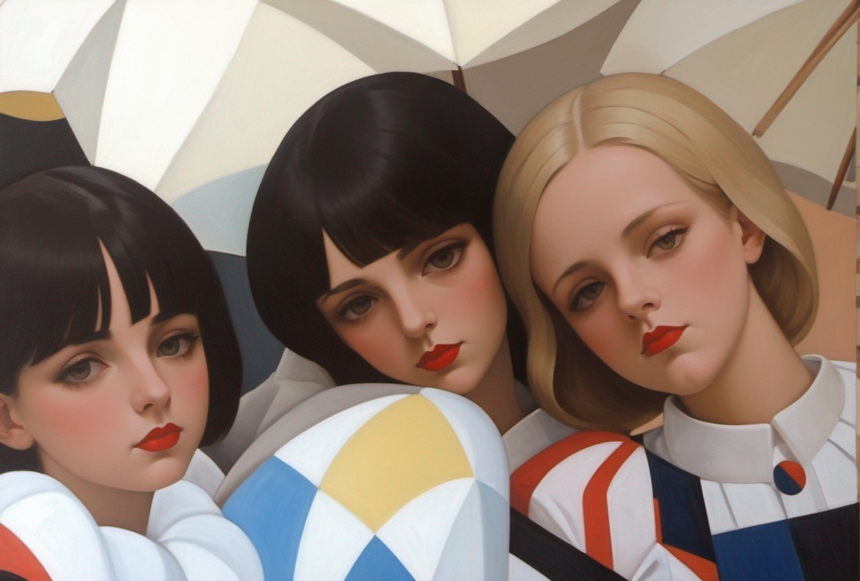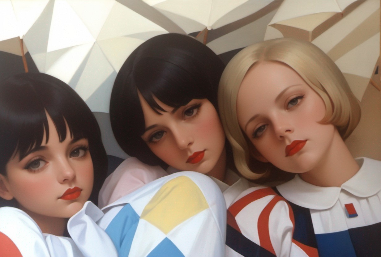 Stylized female figures with bob haircuts in striped outfits on geometric background