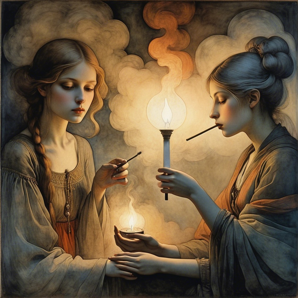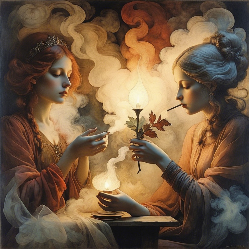 Two ethereal women sit in soft, muted tones. One holds a glowing lantern while the other strikes a match, creating a dreamy atmosphere filled with smoke and gentle shadows.