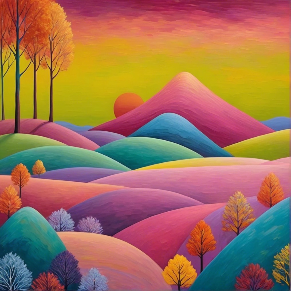 A vibrant landscape features rolling hills in hues of pink, blue, and green, dotted with stylized trees showcasing autumn colors against a dreamy, sunset sky.