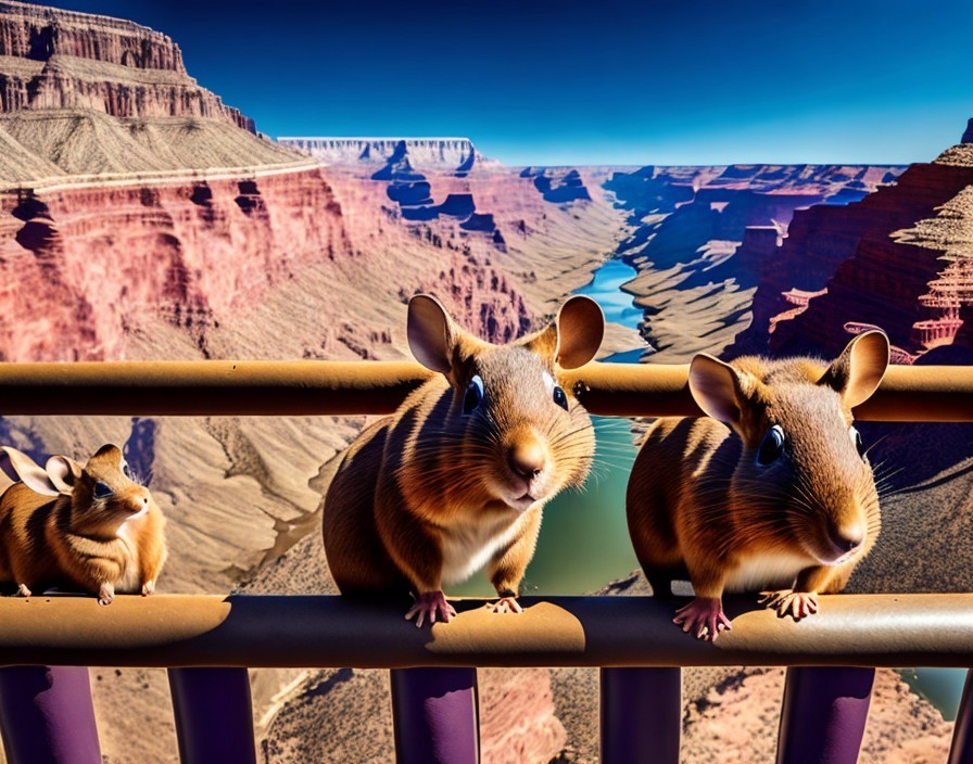 Three illustrated chipmunks on a wooden railing with a scenic canyon and blue sky in the background.