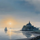 A serene sunset scene features a silhouette of a castle on a hill, with a sailboat gliding across the calm waters, reflected against a large, glowing sun and distant mountains.