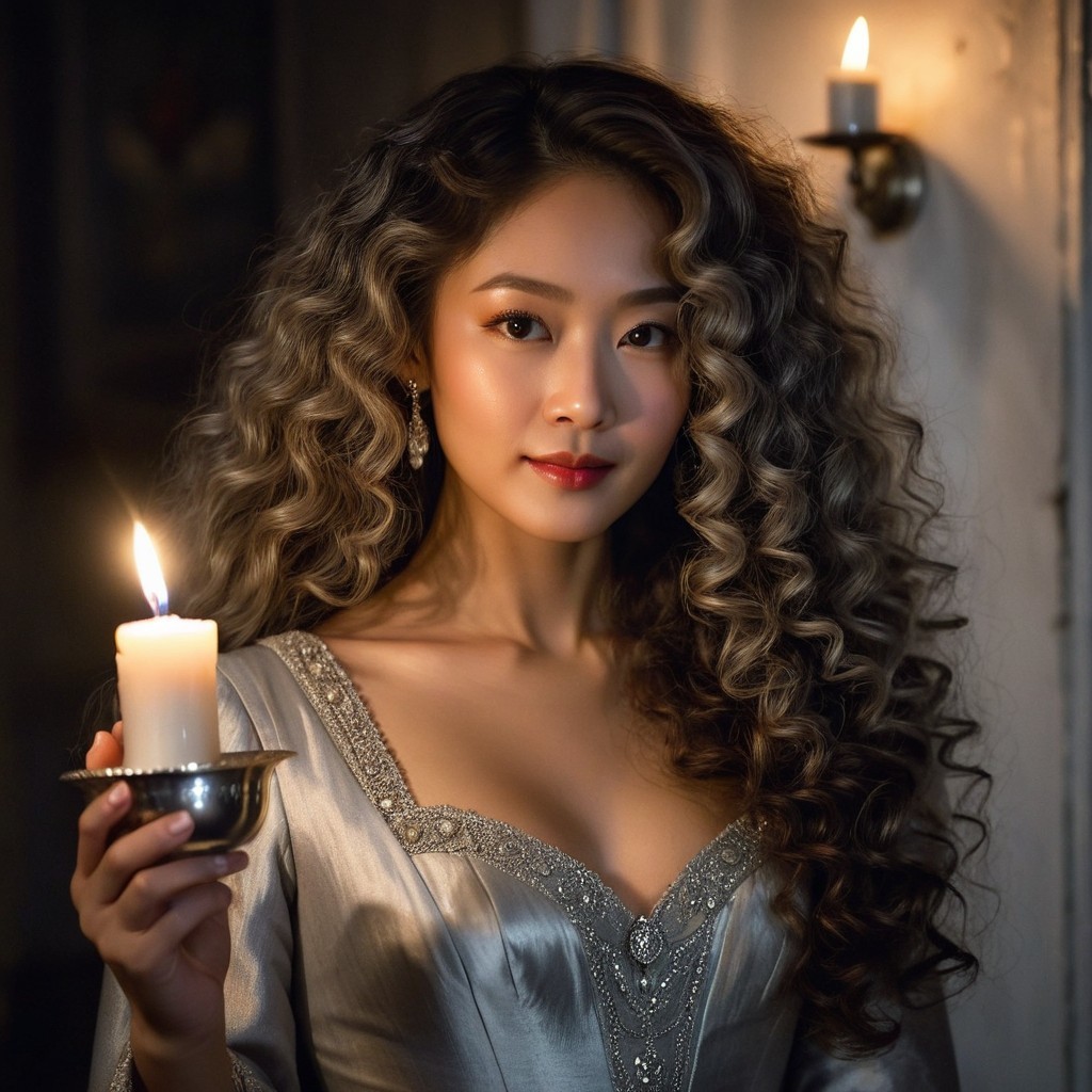 A young woman with voluminous curly hair holds a lit candle in a dimly lit room, wearing an elegant satin gown adorned with intricate details. The ambiance is both mysterious and enchanting.