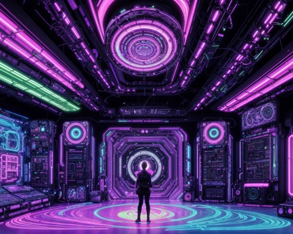 In a vibrant futuristic setting, musicians create dynamic sounds amid neon hues and intricate synthesizers.