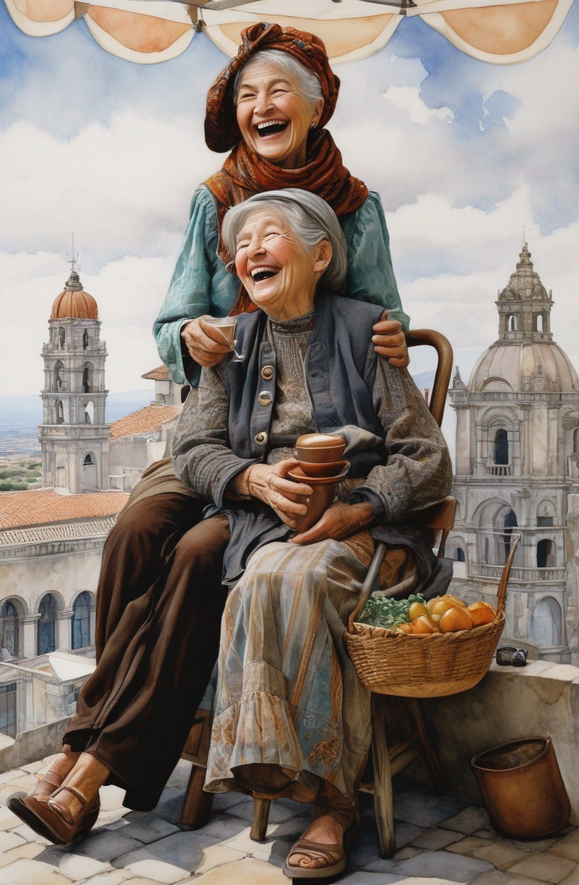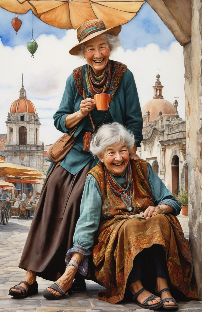 Two joyful elderly women wearing hats and colorful clothes laugh heartily while sitting and holding tea cups, with an old town backdrop.