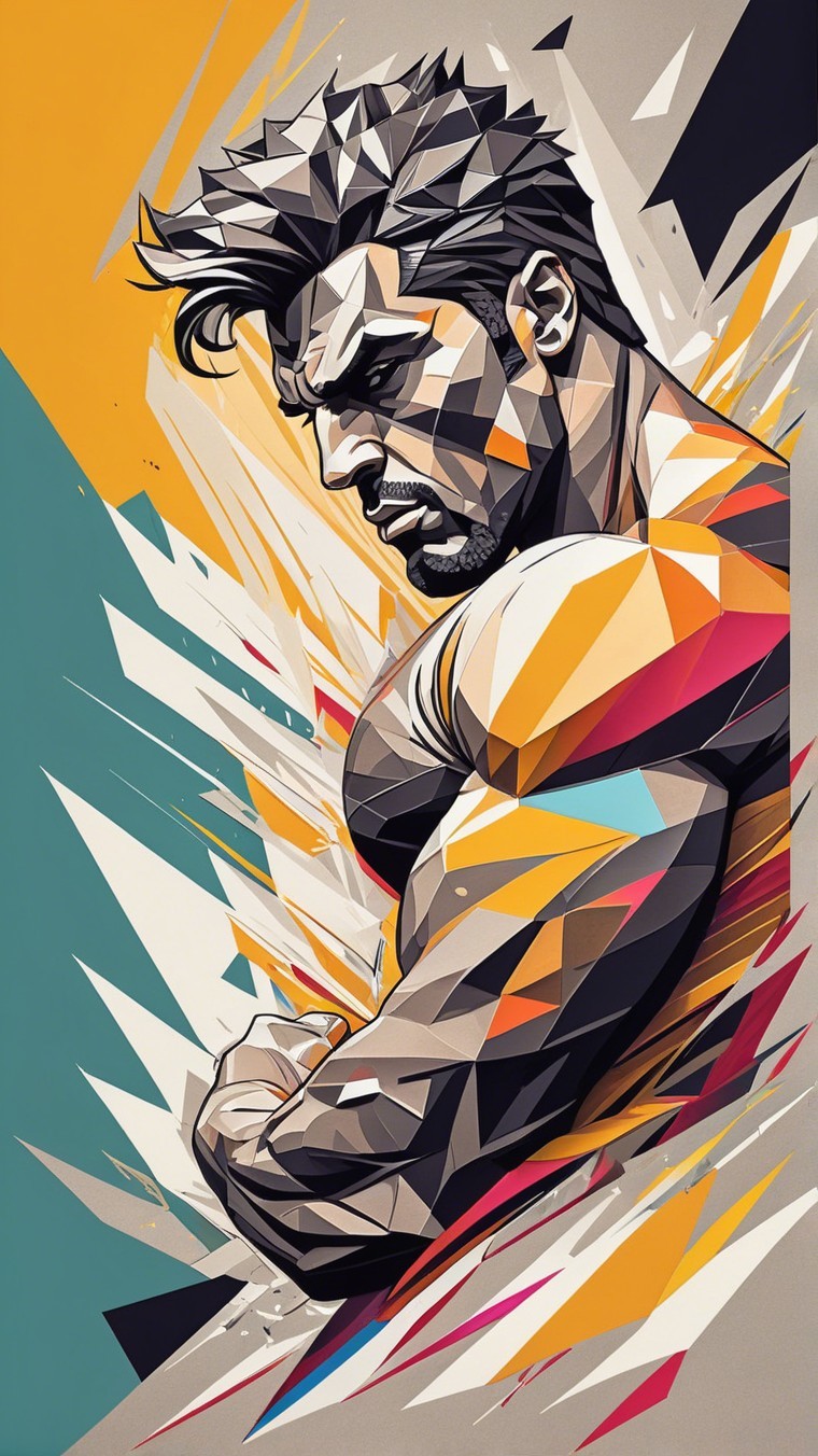 The image features a stylized, geometric portrait of a muscular man. His expression is intense, with vibrant colors and angular shapes creating a dynamic, bold aesthetic.