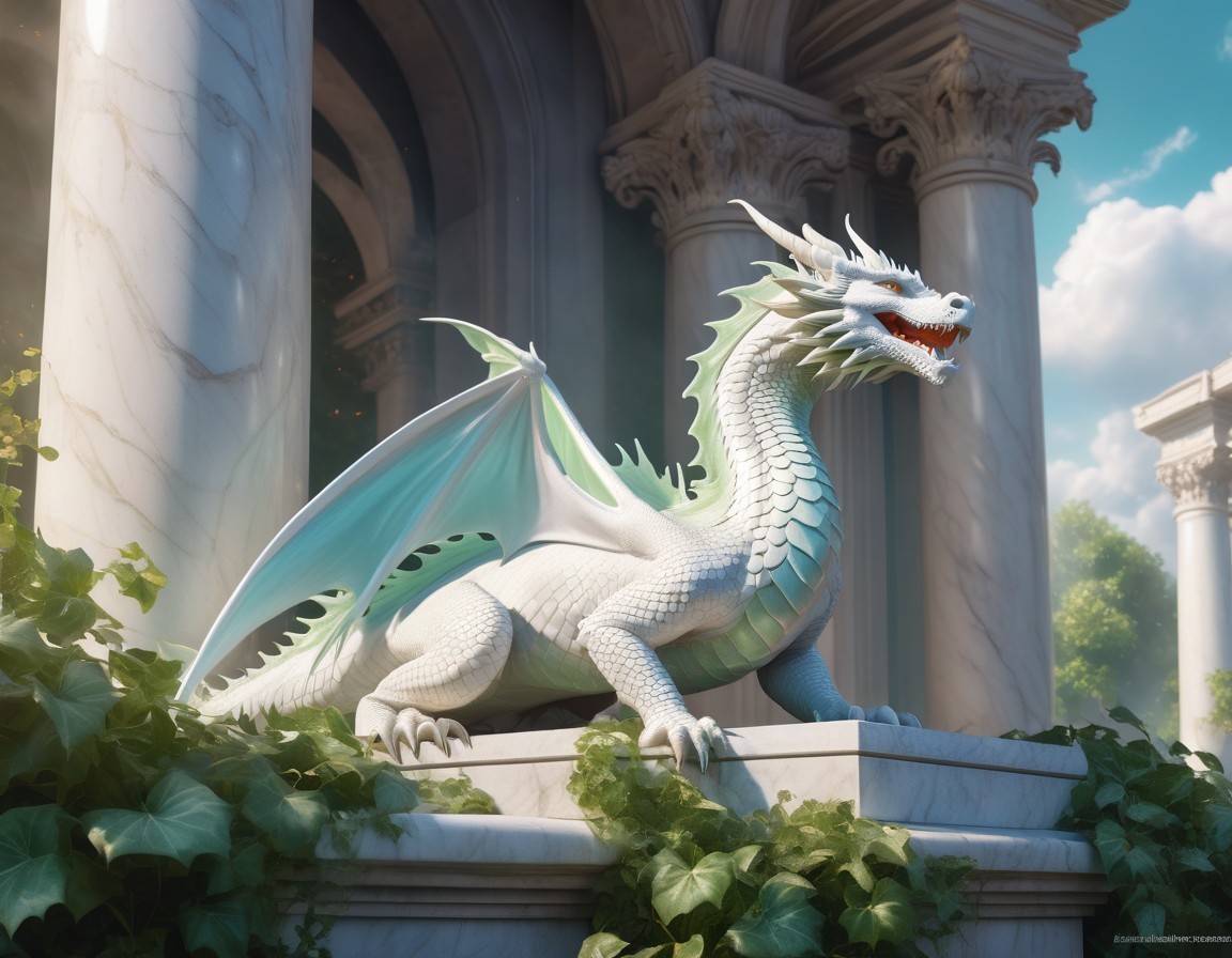 Soft and translucent clouds framing a youthful white dragon, iridescent scales . Tiny playful butterflies and colourful insects creating a hazy light and dappling shadows. White marble columns in the background with pale green ivy crawling up