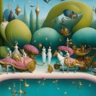The image depicts a surreal dreamscape with ethereal figures, vibrant colors, and flowing forms. Statuesque characters are accompanied by a white horse, set against a fantastical backdrop of floating orbs and serene landscapes.