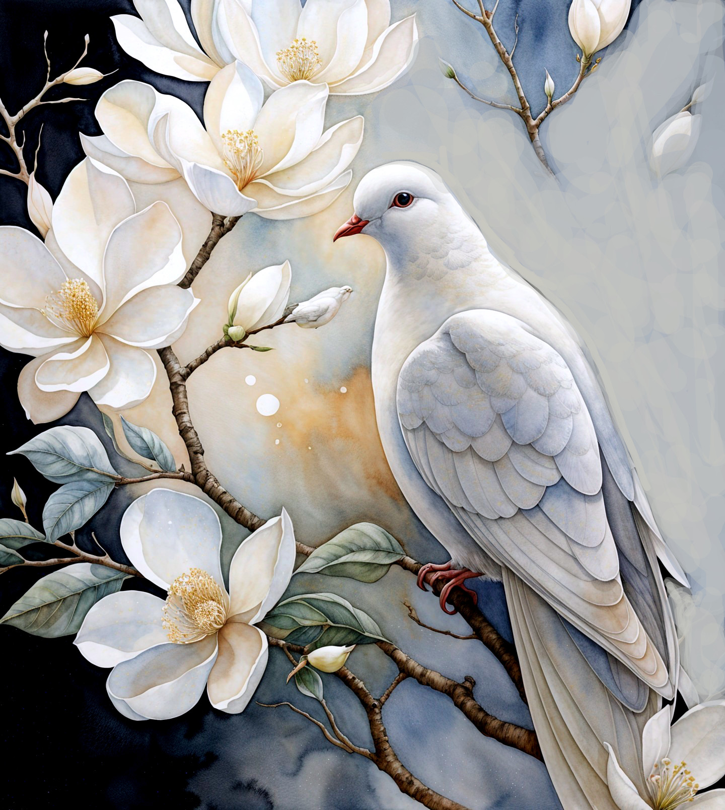 + Prompt:Create an abstract watercolor and ink depiction of a white dove in a white magnolia tree. Include fractal and Art Nouveau flourishes. Style of Daniel Merriam, Charles Rennie Mackintosh.