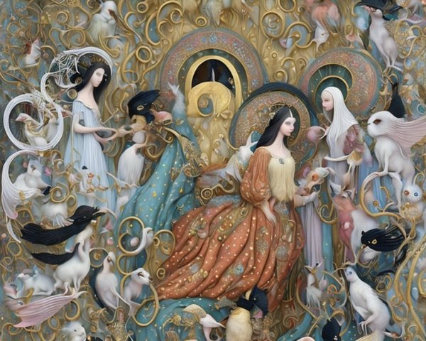 A fantastical landscape features ethereal figures and surreal elements, blending vibrant colors and whimsical architecture. Birds and nature enhance the dreamlike atmosphere, inviting imagination.