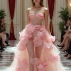 A stunning model showcases a strapless pink gown adorned with floral embellishments, featuring a layered skirt and a dramatic train. The elegant setting highlights the dress's beauty.