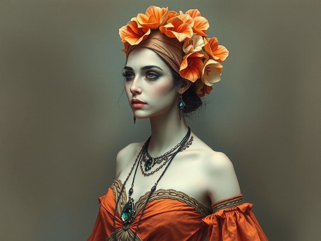 An illustration of a woman with a red turban and matching attire, adorned with an elegant jewel, exuding a sophisticated and regal aura.