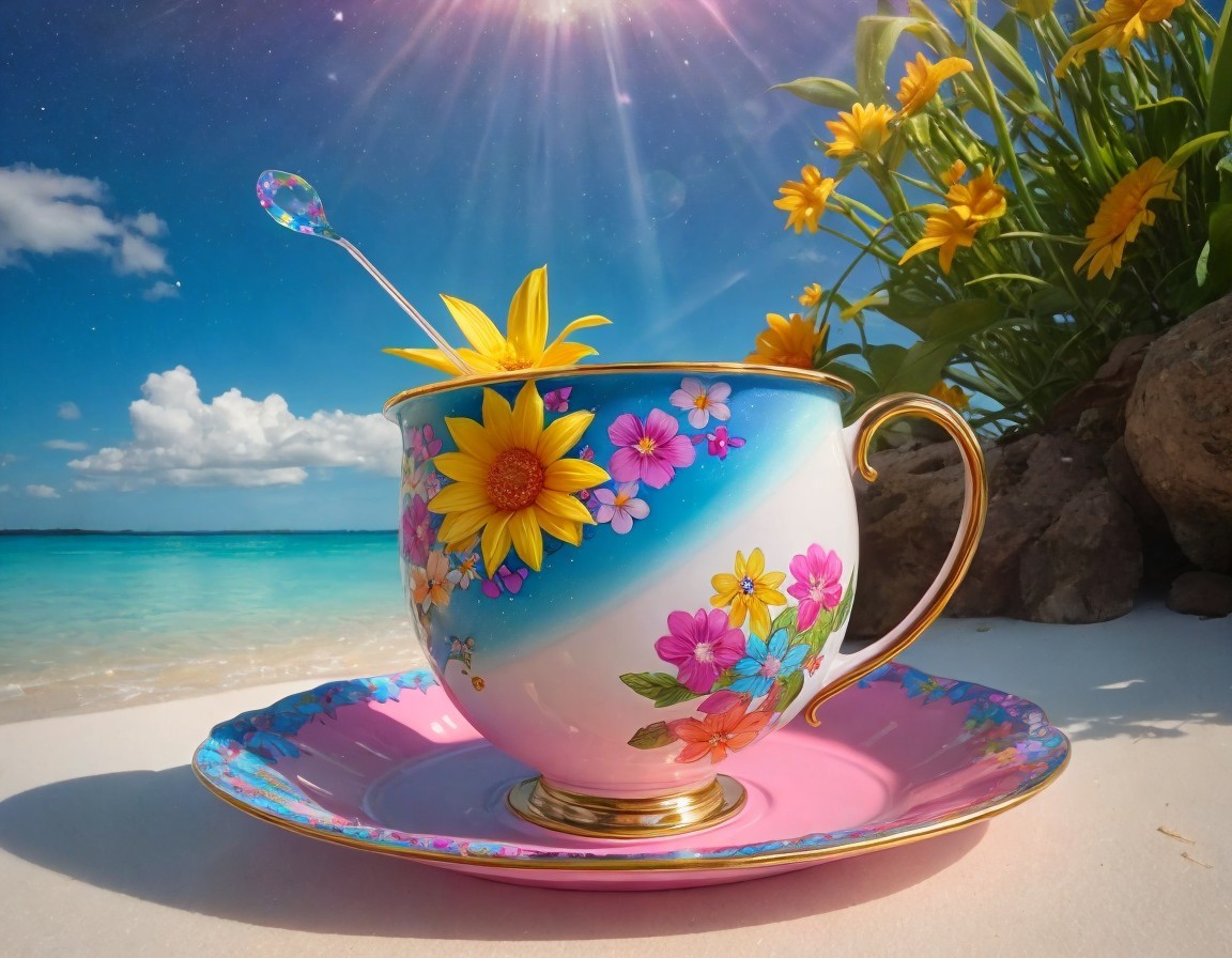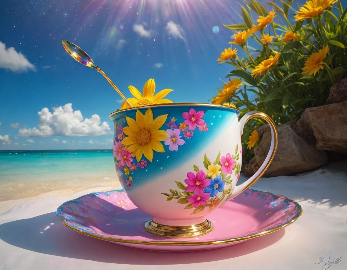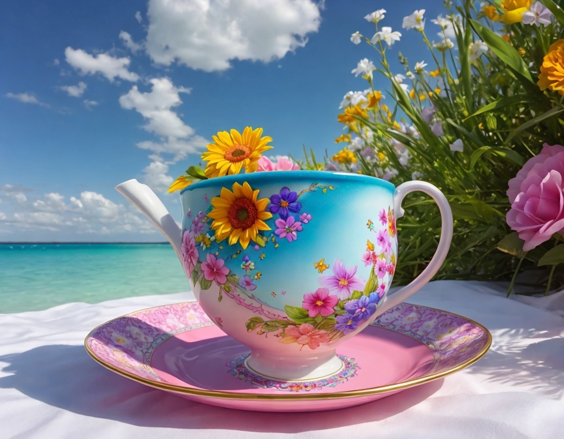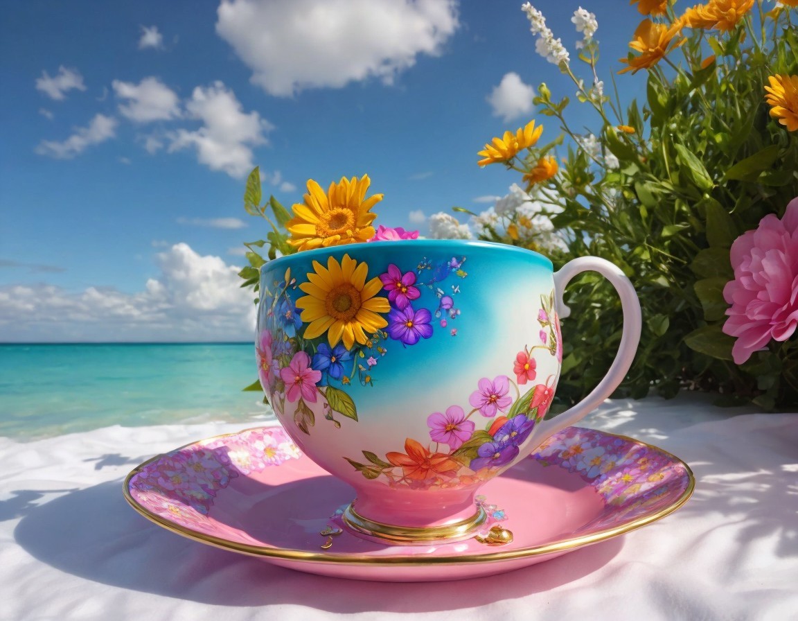 A vibrant teacup adorned with floral patterns sits on a pink plate, filled with cheerful yellow flowers. Bright blue skies and a serene ocean backdrop enhance this picturesque coastal scene.