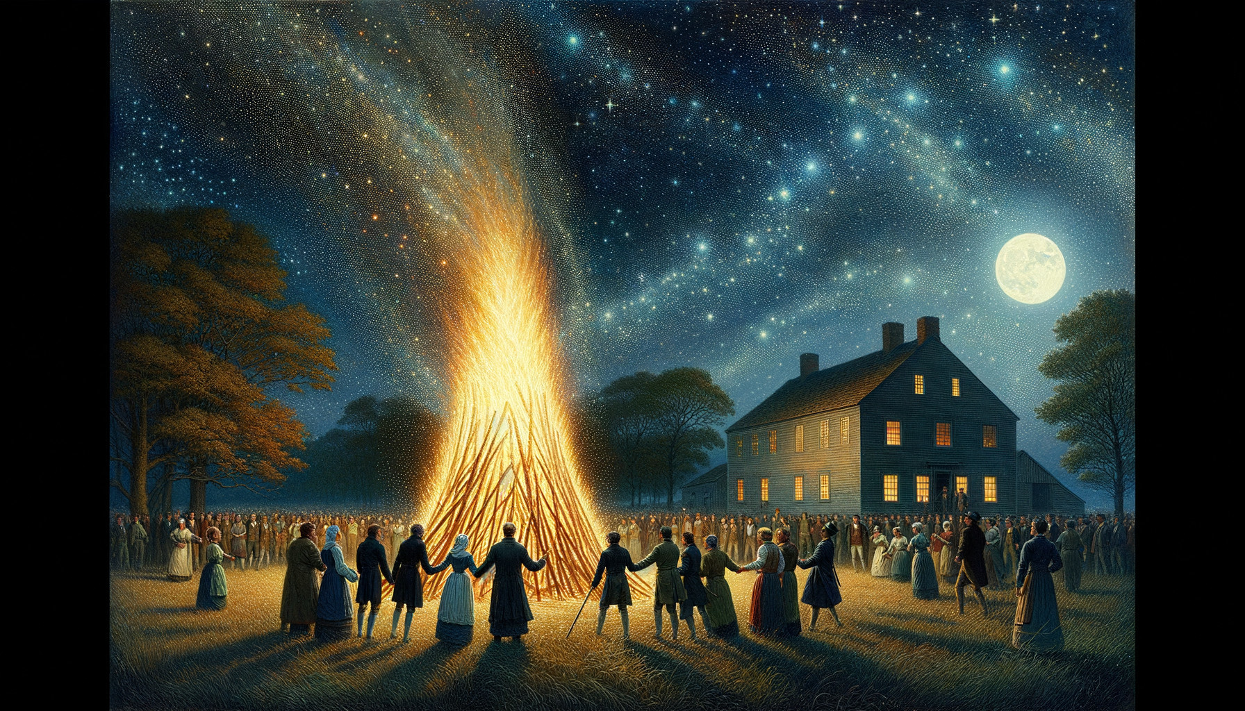 Prompt: "Starry night. A Bonfire had been assembled safely downwind of the farmhouse in an adjacent field. He was putting a torch to the towering bonfire. He stood back from the growing heat of the fire, watching, as the flames took hold, curling towards a sky. People gathered around the bonfire, laughing, as everyone join hands, and with glowing faces and shining eyes moved around it in a wide, noisy circle."