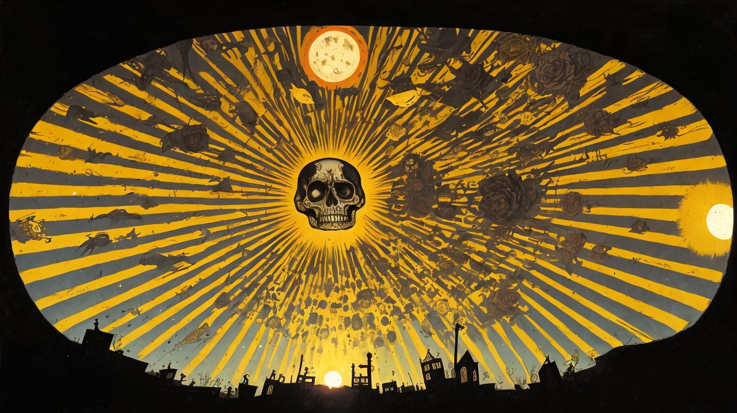 Glowing skull Batman artwork with bats and cityscape against moonlit sky