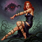 A woman with striking red hair, wearing a dark gown, is entangled in menacing thorny vines. Her expression conveys fear, while a shadowy creature looms ominously in the background.
