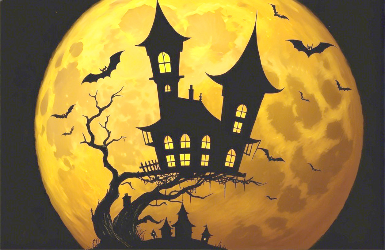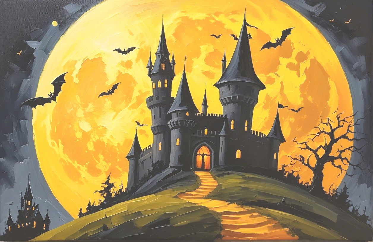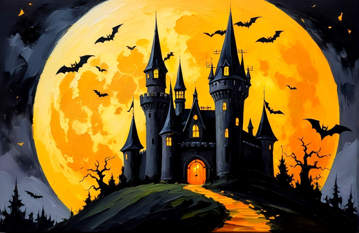 A spooky black castle with pointed towers looms against a large, glowing orange moon. Bats fly around, and twisted trees add to the eerie atmosphere, creating a haunting Halloween scene.