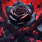 A stunning rose with vibrant red petals and deep black edges, surrounded by lush green leaves. The background features a mystical glow, enhancing the rose's enchanting beauty.