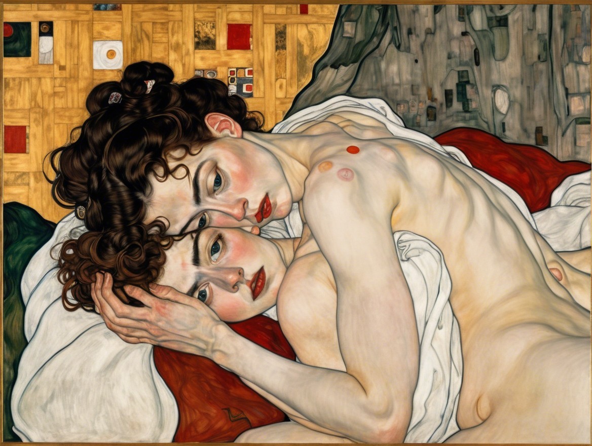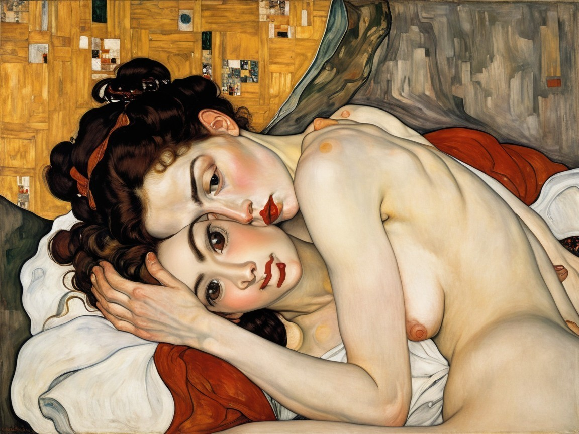 The artwork features a mother and daughter in a tender embrace, their bodies intertwined against a backdrop of warm colors and textured patterns, conveying intimacy and vulnerability.