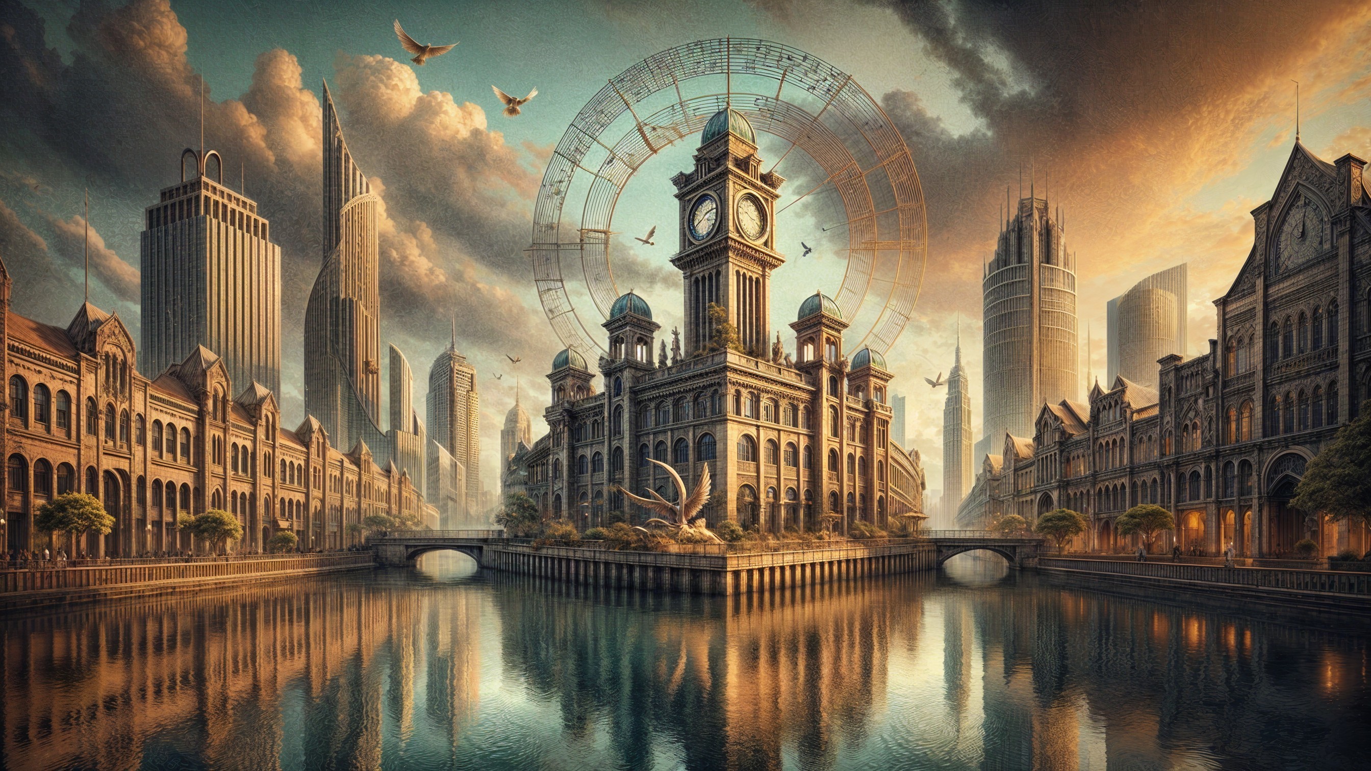 Grateful thanks and credit to Bee-folco, for a fascinating prompt, which i used, to go off on a tangent. A vibrant cityscape at sunset features a grand clock tower beside modern skyscrapers. Soft clouds and swirling patterns enhance the skyline, while birds soar above a serene river reflecting the colours of nature.