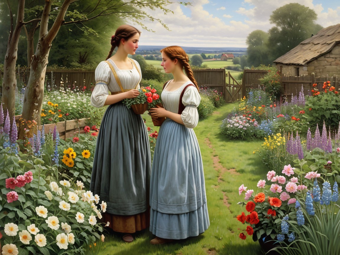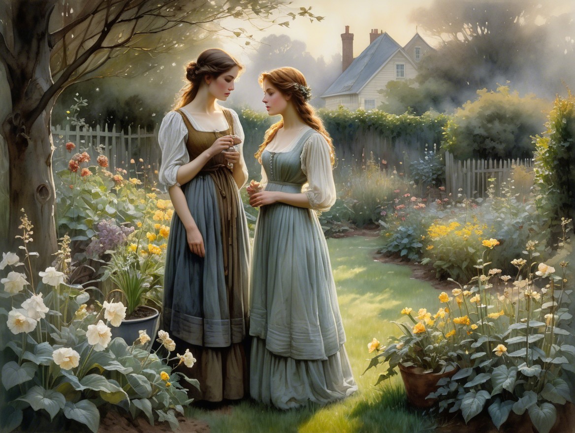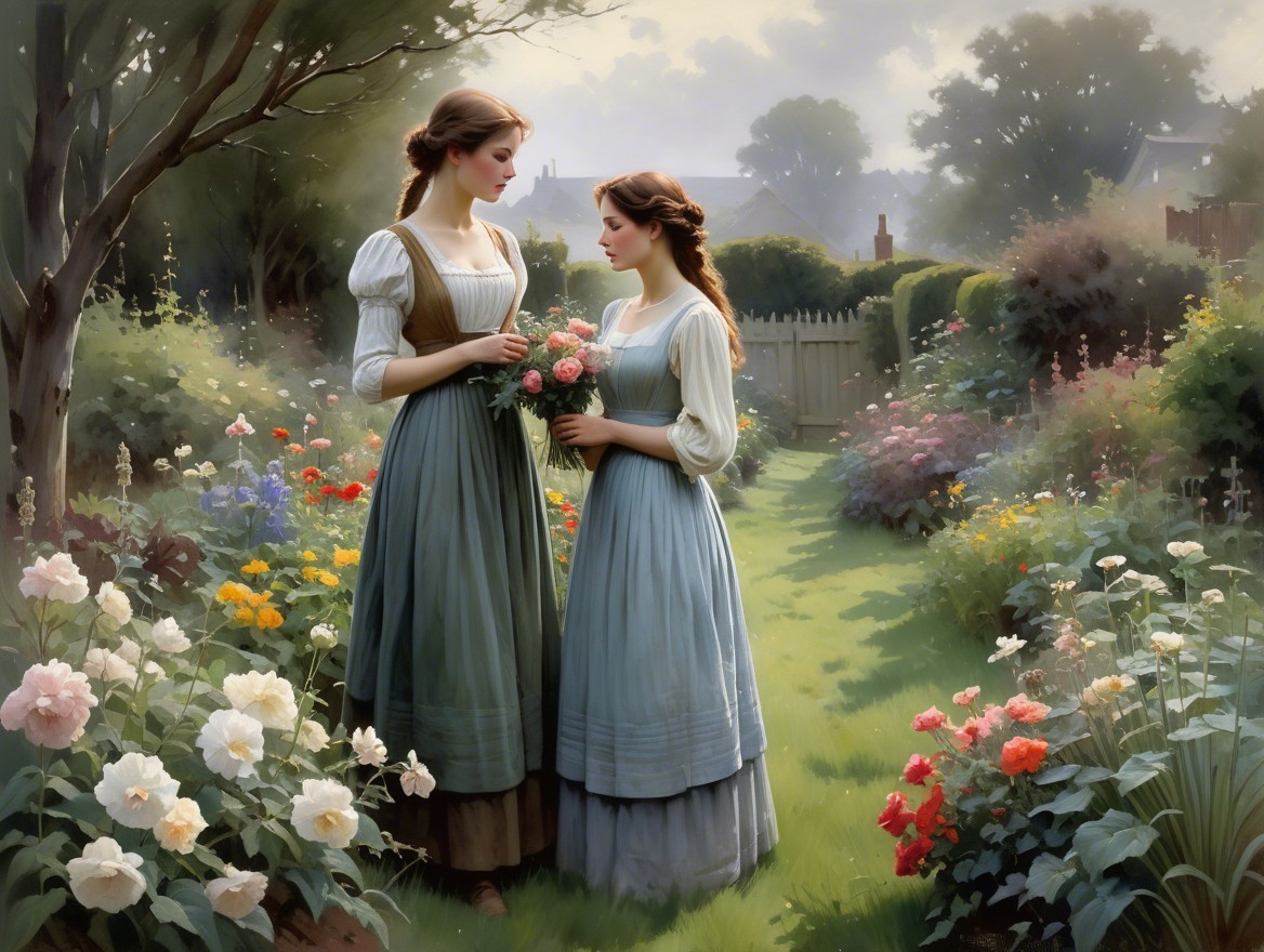 Two women in elegant period dresses stand together in a vibrant garden, surrounded by blooming flowers and lush greenery. Soft sunlight filters through the trees, creating a serene atmosphere.