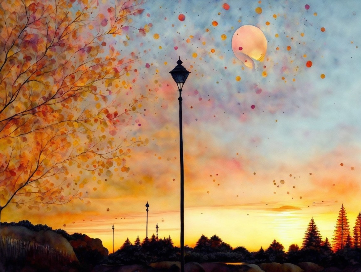 Colorful sunset watercolor with street lamp, autumn tree, and starlit sky.