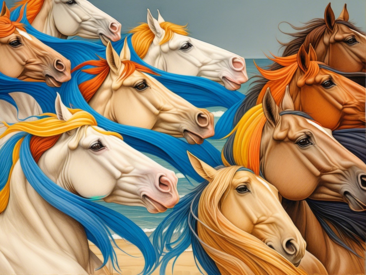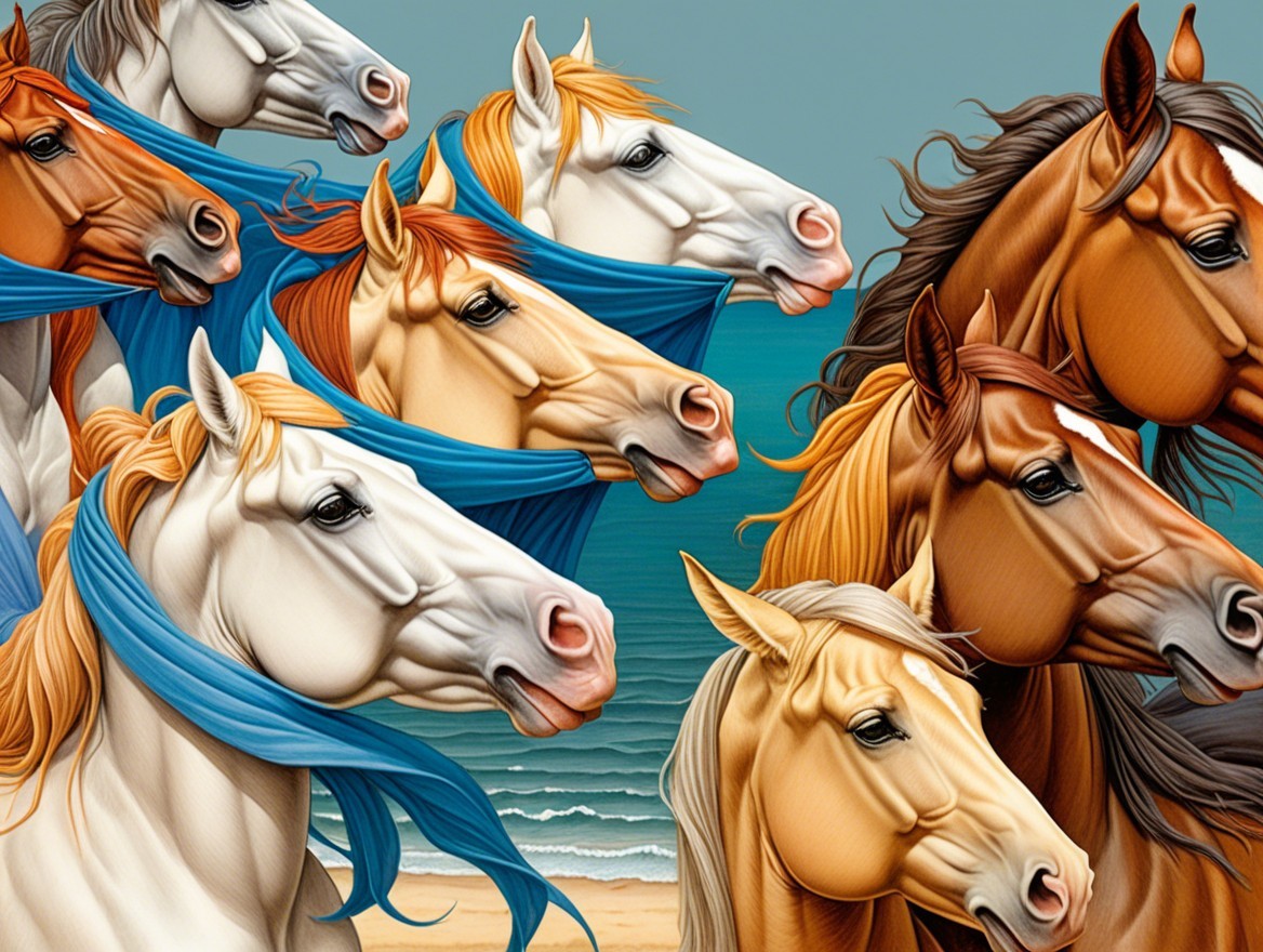 A vibrant illustration of several horses, each adorned with colorful scarves. Their expressive faces emerge against a serene beach backdrop, showcasing a blend of elegance and energy.