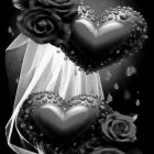 The image features two elegant figures in stunning black gowns with intricate embellishments, illuminated by dramatic beams of light. Each holds a rose, enhancing the enchanting atmosphere.