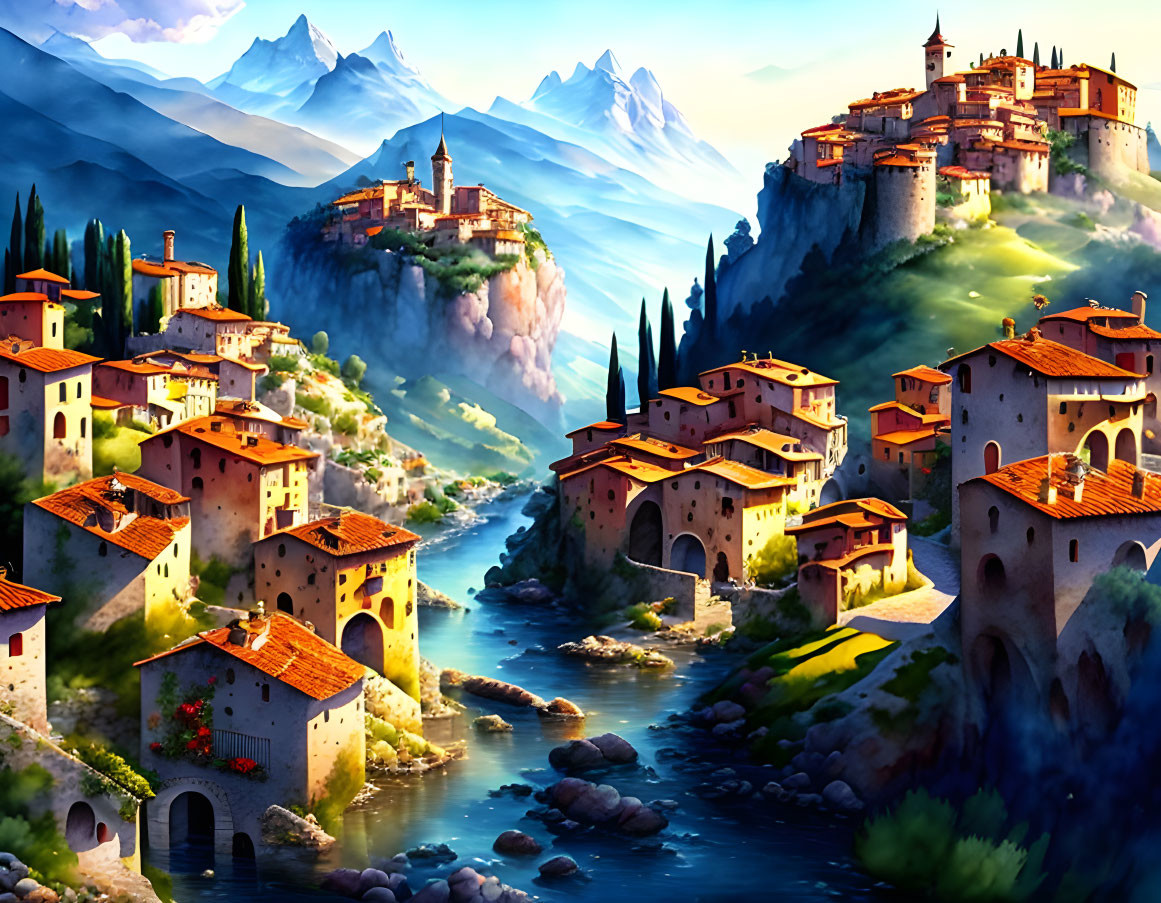 Prompt: A bird's eye view of a italian village, town in mountainous landscape, a grand bridge crossing a river, fantasy beautiful castle in the distance, watercolor, realistic watercolor painting.