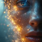 A close-up of a woman's face with shimmering, golden, electric-like patterns illuminating her skin, combined with a mystical blue light reflecting in her eye, creating a fantastic, ethereal effect.