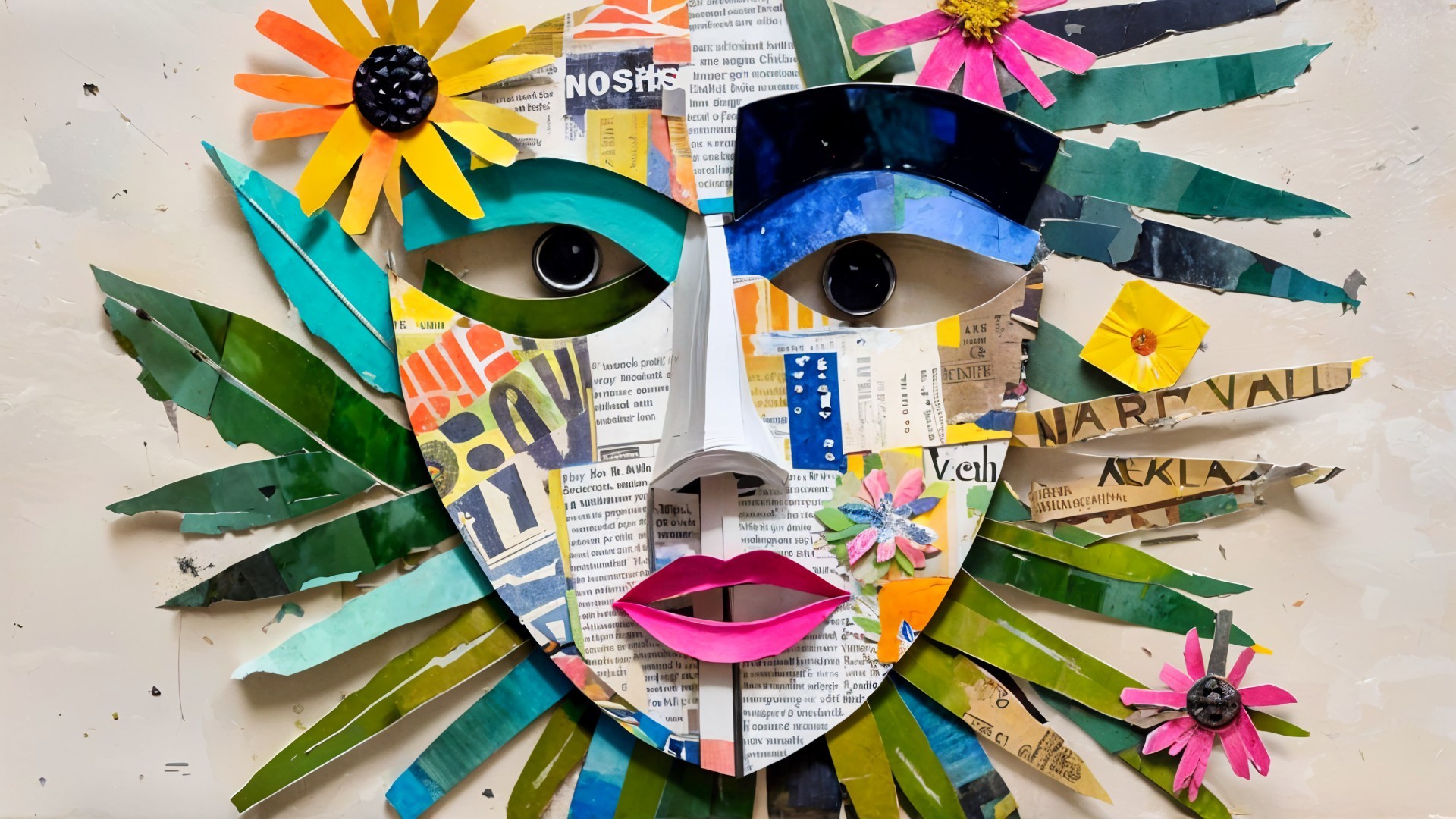 In tribute to the artist, Freda Kahlo. The image features a vibrant mixed-media collage of a face, with bright colors, flowers, and various textures. It combines paper elements to create a striking and artistic portrait.
