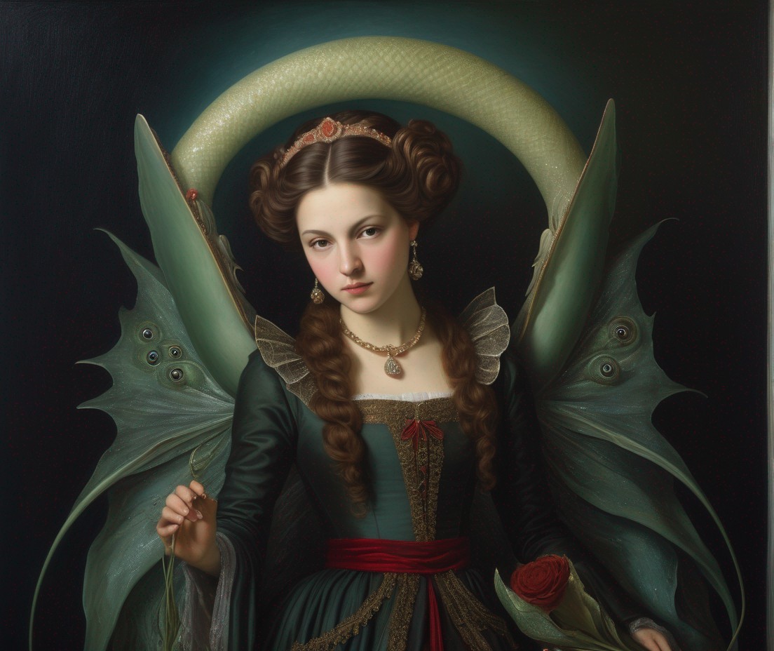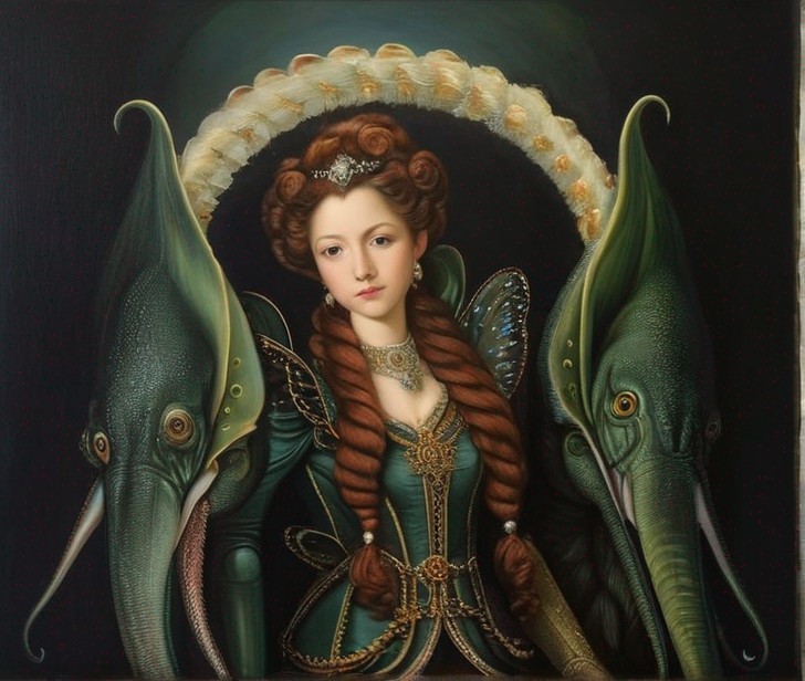 + Prompt:Lovecraftian fairytale. This artwork amalgamates the artistic styles of Lavinia Fontana and Sarah Goodridge, showcasing a harmonious fusion of their respective techniques. The painting exemplifies a seamless integration of Fontana's mastery of portraiture and Goodridge's delicate brushwork, resulting in a visually captivating composition that embodies the essence of both artists' unique contributions.