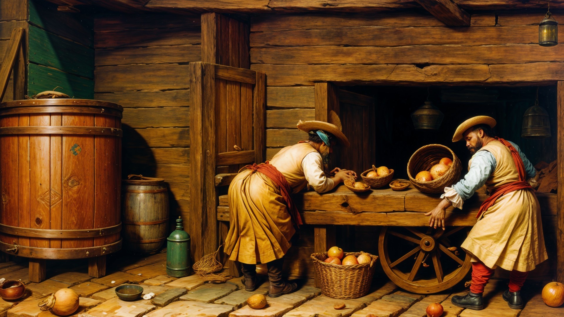 A young woman in a vintage outfit gathers oranges in a rustic wooden interior, surrounded by baskets of fruit and soft evening light streaming through a window, evoking a serene, nostalgic atmosphere. This picture began with an old painting of some barrels and other things related to food. Over three generations it comes up with this, which is like a lot of 19th century paintings and photographs of peasants or tribal people doing ordinary things while dressed up to the nines in, as we say, their Sunday best. Why there are oranges in a bird cage I can only speculate. The only thing I can add is that the arms are too long and thin, but it is a largely naturalistic image with a quite convincing chiaroscuro effect of the sunset in the southwest in midwinter which suggests that it is cold in that store room.