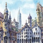 A whimsical cityscape features unique buildings with colorful, ornate towers and domes, blending fairy-tale architecture against a bright, cloudy sky. A tall spire looms in the background.