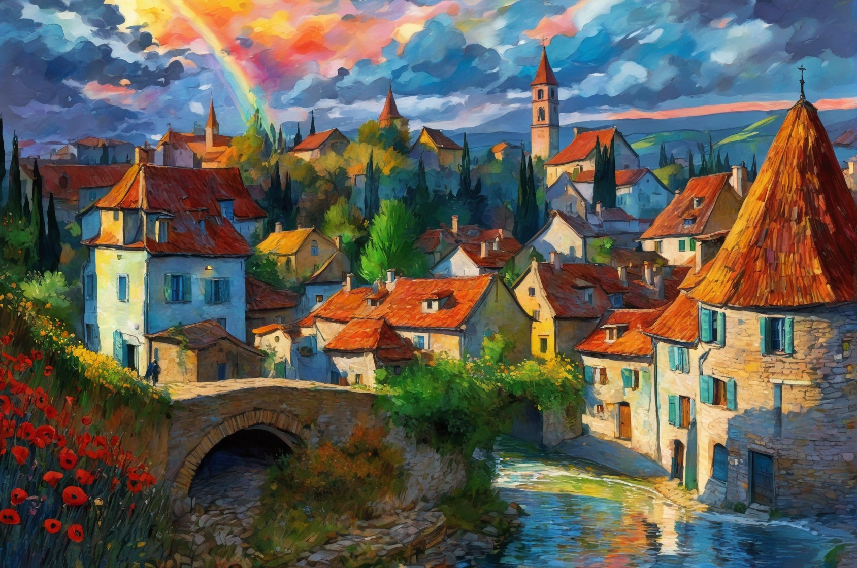 A vibrant painting of an idyllic European village with a bridge, river, and rainbow amidst colorful houses at sunset.