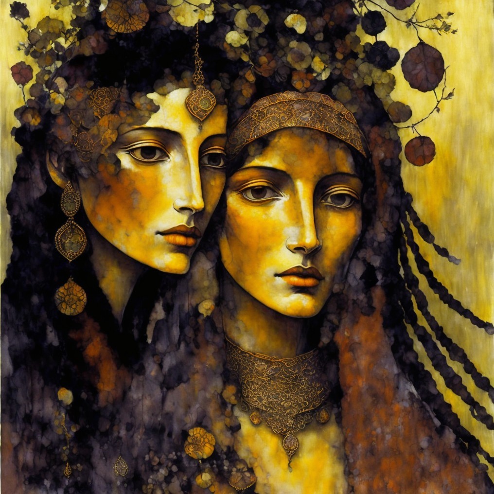 Beautiful woman, portrait in ochre, patina of ancient stone with moss, art brut, moody, somber, desaturated colors, in the style of Paul Klee, Arthur Rackham
