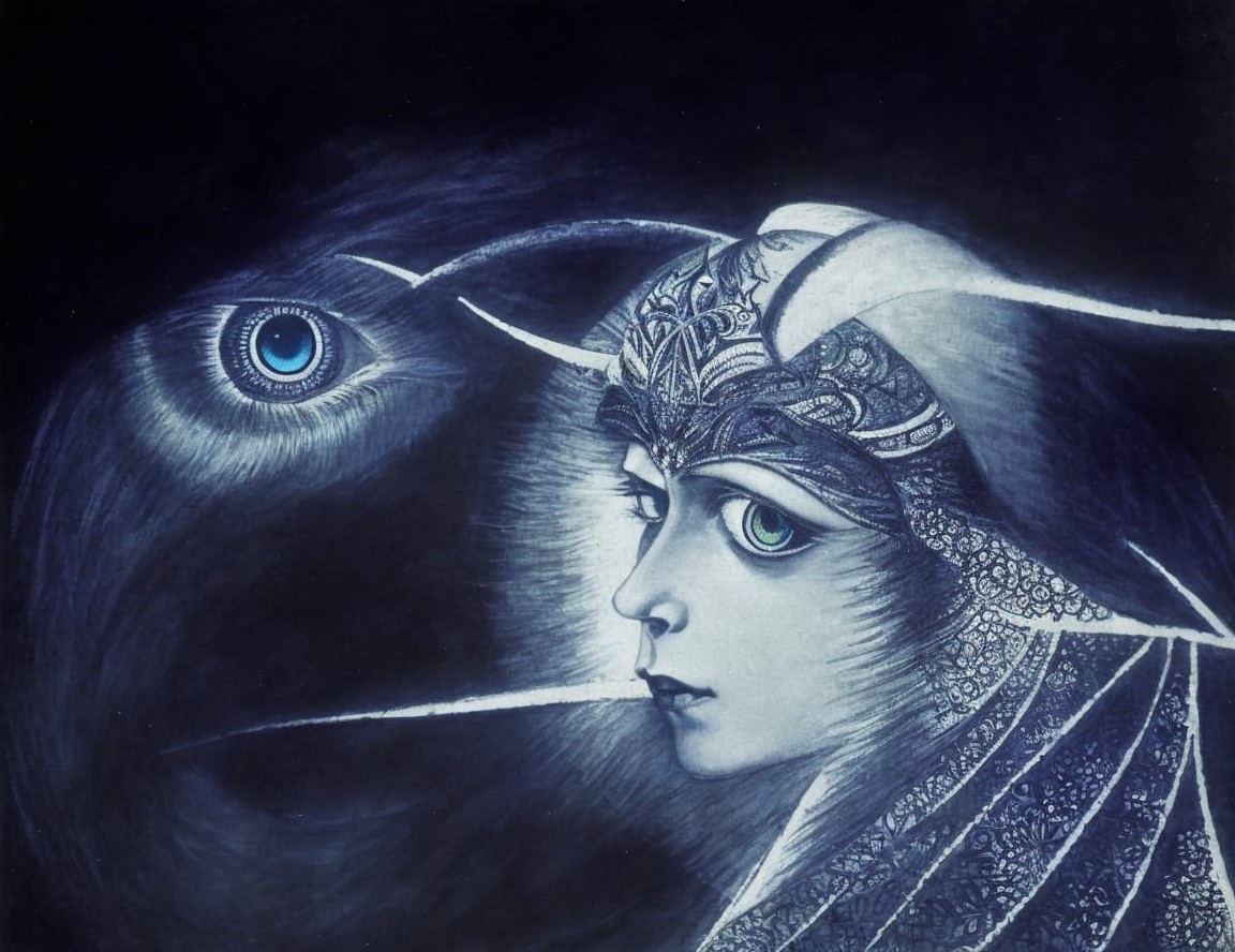 A surreal artwork depicting a woman's face with intricate headwear, merged with an eye and celestial elements in a blue-toned palette.