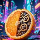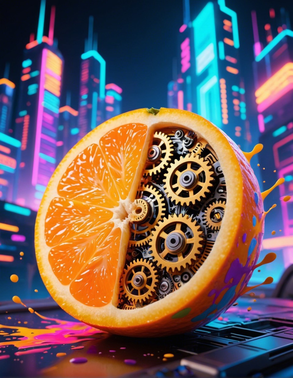 A sliced half orange, revealing intricate golden gears and machinery inside one half of the fruit, a surreal blend of organic and mechanical elements. The orange is depicted with vibrant, natural texture on the left, while the right half exposes a complex system of cogs and mechanisms. Splashes of colorful paint,
