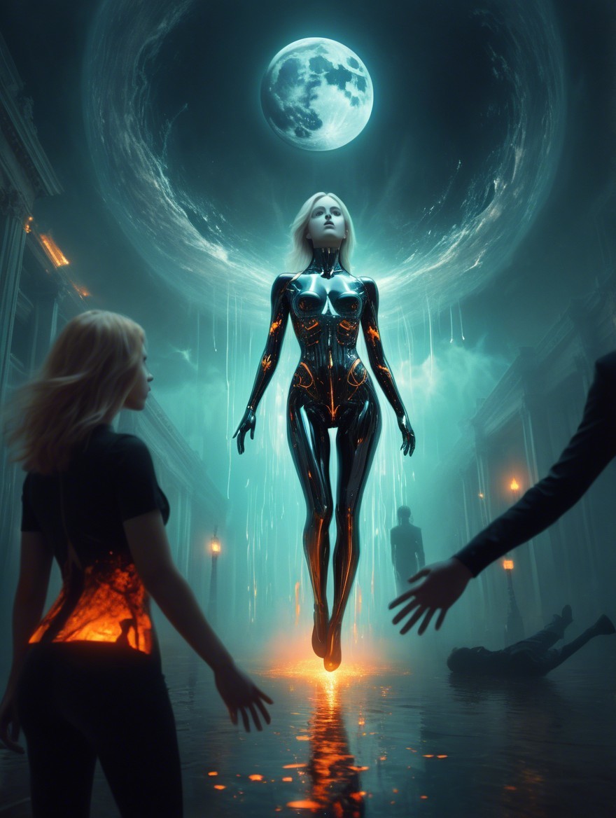 Futuristic humanoid figure with wings in moonlit landscape