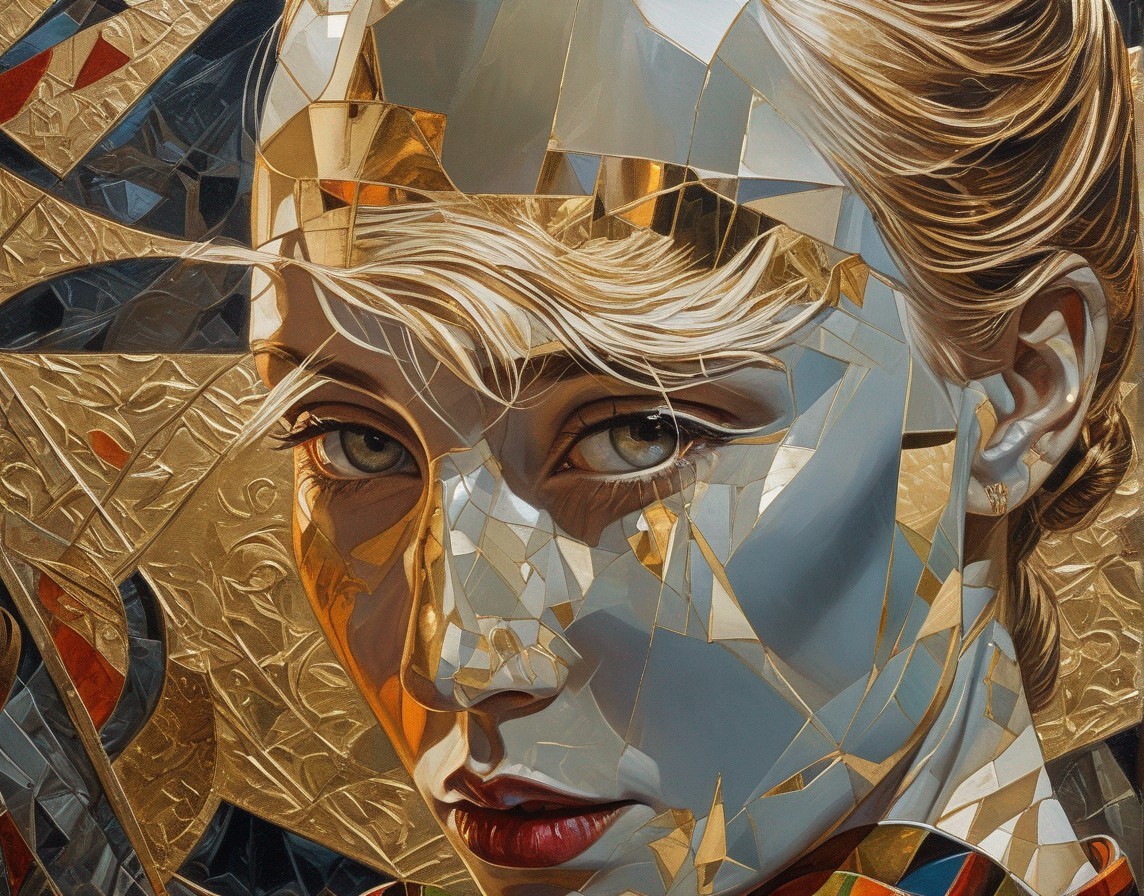 A detailed digital portrait of a woman with striking eyes against a stylized, ornate clockwork background.