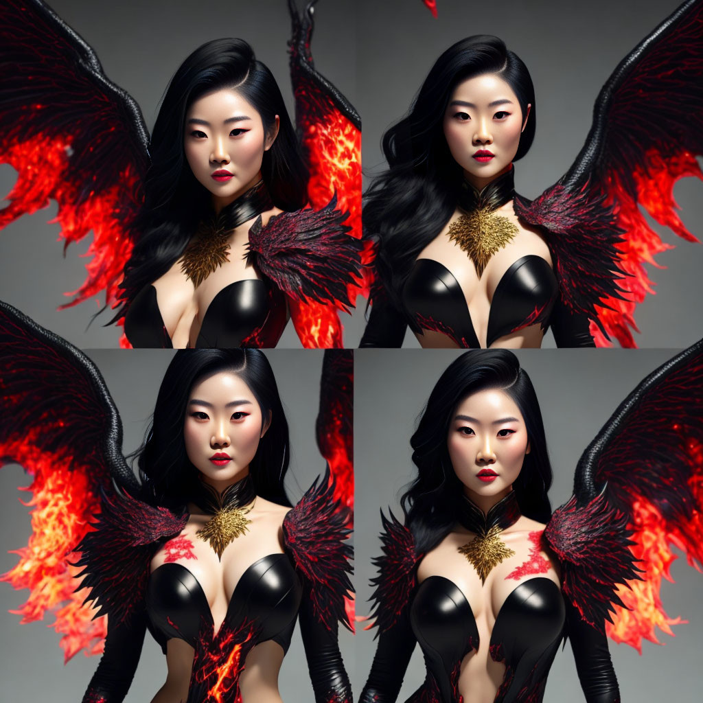 Dark-haired woman in black outfit with red lipstick in four poses, one with fiery wing effect