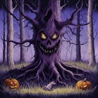 A dark, eerie forest scene at twilight with a large, twisted tree at the center, featuring a sinister face with glowing yellow eyes and sharp teeth. The tree's bark is purple, adding to the ominous atmosphere. Surrounding the tree is patchy grass, and two carved pumpkins sit on either side, their faces lit with a dim glow. In front of the tree, a small, frightened rabbit crouches, adding a touch of innocence to the menacing environment. The background consists of thin, bare trees reaching upwards, shrouded in a purple haze.