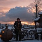 An incredibly detailed, photorealistic Lego scene shows a bundled-up steampunk-Victorian Lego Minifigure dressed in a black top hat with a red and orange striped rim
