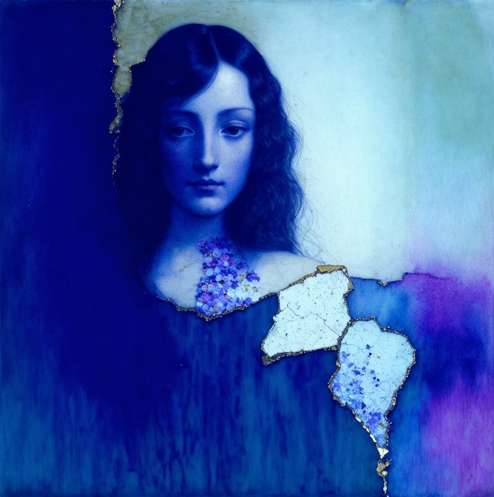 A serene portrait of a woman with long, dark hair, set against a deep blue background. Golden and white textures enhance her ethereal presence, creating a captivating focal point.