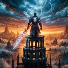 A heroic figure stands atop a grand, circular pedestal, wielding a glowing sword. The scene is set in a mystical landscape of clouds and jagged mountains, under swirling, dramatic skies.