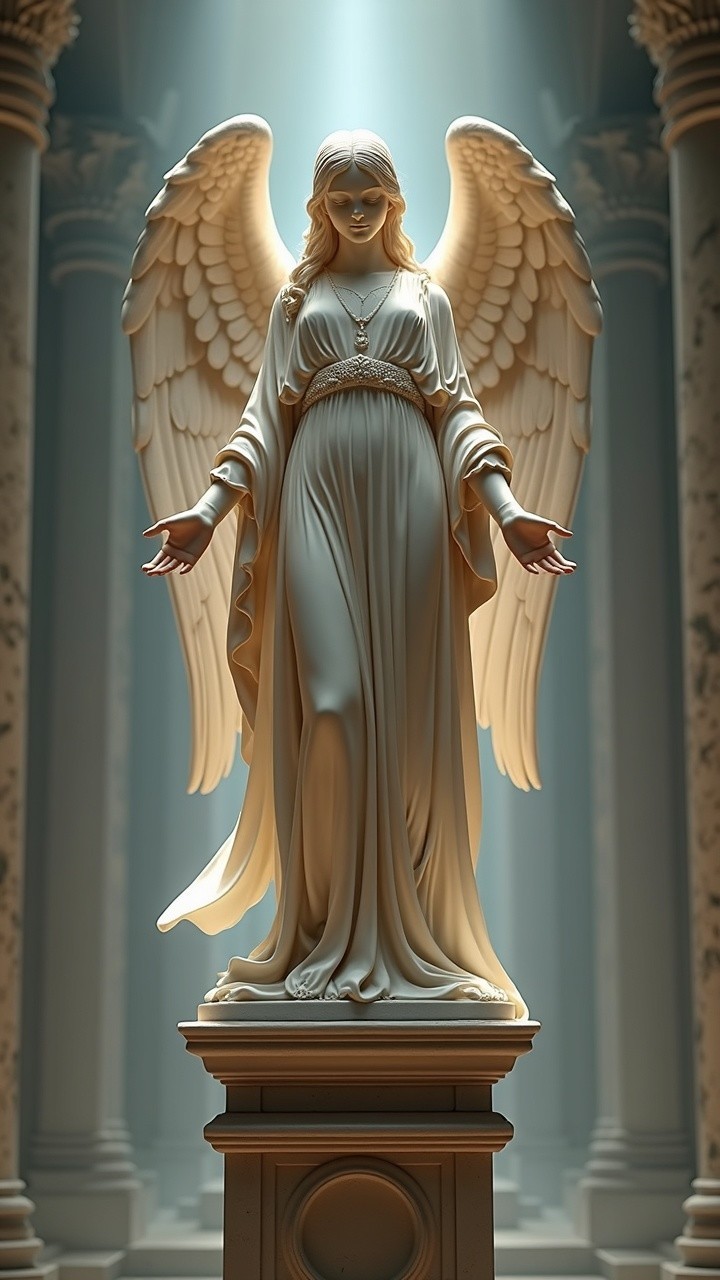 A majestic statue of an angel, adorned in flowing white robes, stands with outstretched arms. The angel's wings are intricately detailed, illuminated by soft light, creating a serene and divine atmosphere.
